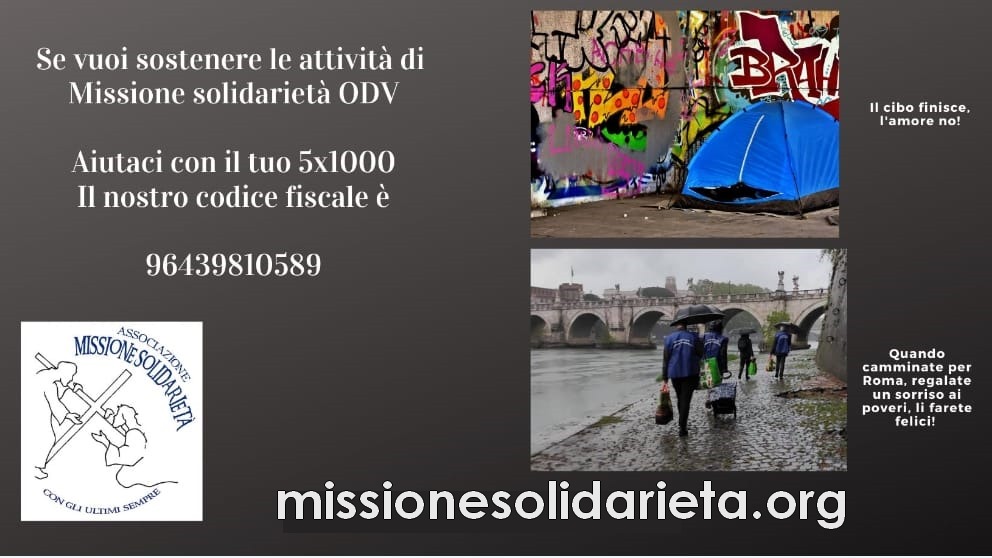 Missione solidarietà vive grazie al sostegno dei suoi volontari, di amici, benefattori, che nel tempo si sono legati alle sue semplici opere. Se volete aiutarci in strada, durante la missione serale e notturna, potete scriverci a info@missionesolidarieta.org vi risponderemo il prima possibile.